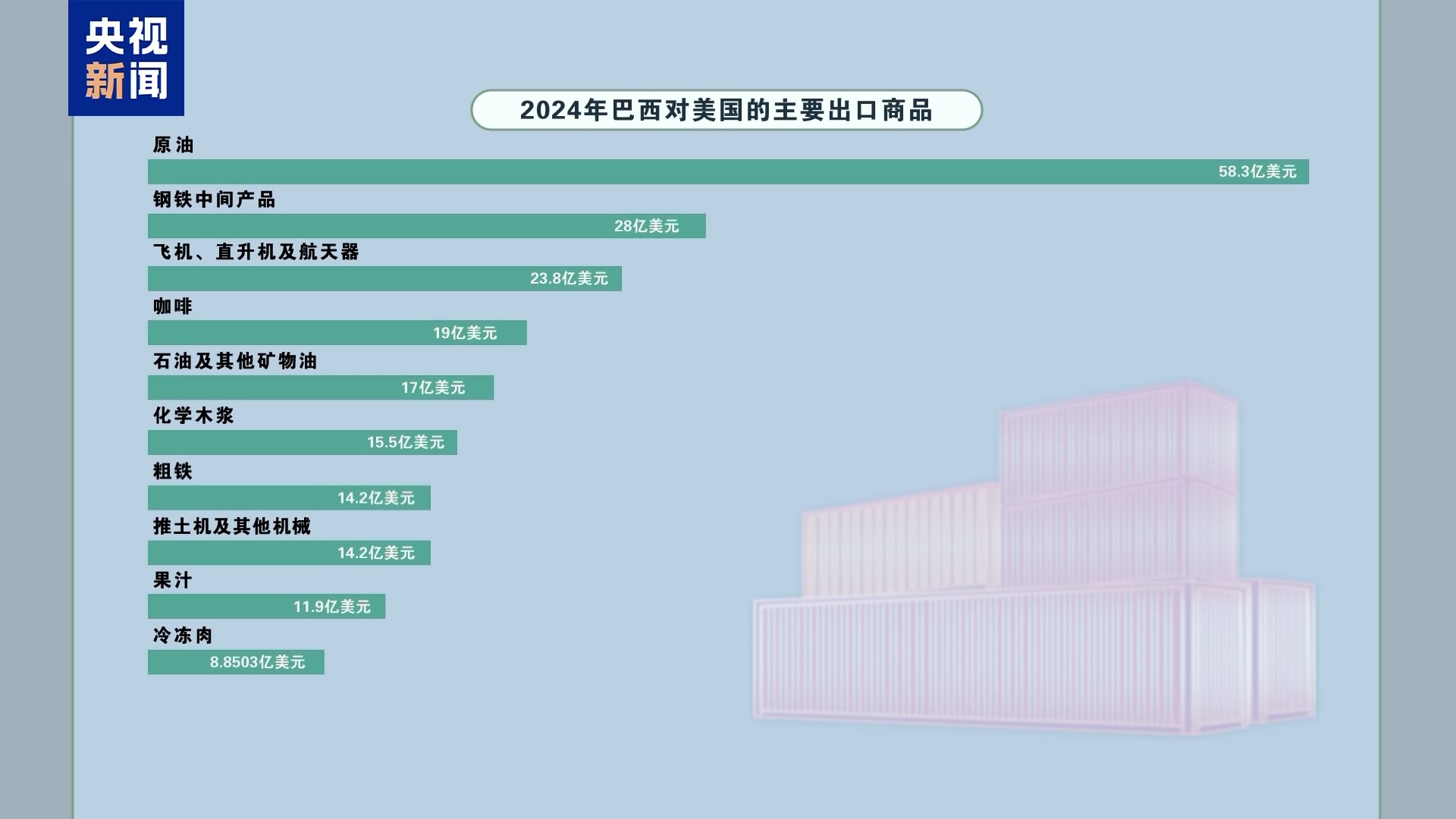 美国有线电视新闻网报道称,2024年,巴西向美国出口了总额高达404亿美元的商品。咖啡、果汁、冷冻肉等美国民众日常食物以及原油、粗铁等基础化工及能源商品都在排名前十内。